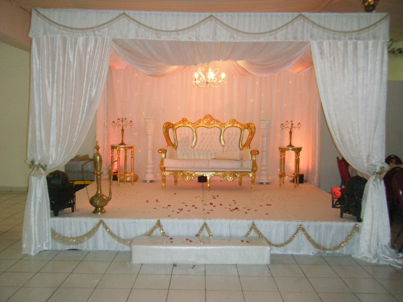 poduim, voilage, banquette des mariés (argent/blanc ou doré/blanc)
