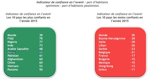 وأبدى 75 في المائة من المغاربة الذين استطلعت آراءهم، ثقتهم في ازدهار الاقتصاد المغربي سنة 2015، مقارنة بسنة 2014، بينما ذهبت آراء 17 في المائة إلى أن الوضع لن يتغير بالمقارنة مع سنة 2014، في حين توقع 10 في المائة أن تعاني البلاد من صعوبات اقتصادية.