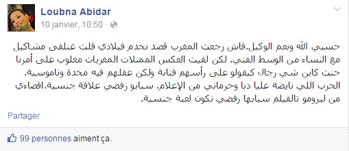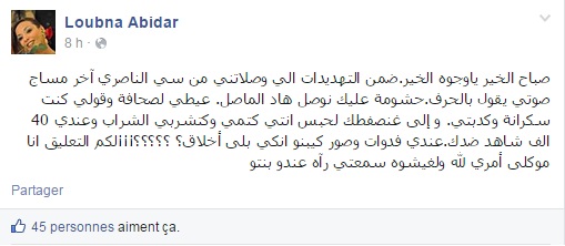 وكتبت لبنى على جدار حسابها بموقع التواصل الاجتماعي فايسبوك يوم السبت الماضي "حسبي الله ونعم الوكيل.فاش رجعت المغرب قصد نخدم فبلادي قلت غنلقى مشاكيل مع النساء من الوسط الفني. لكن لقيت العكس الممتلات المغريات مغلوب على أمرنا حنت كاين شي رجال كيقولو على رأسهم فنانة ولكن عقلهم فيه مخدة وناموسية. الحرب اللي نايضة عليا دبا وحرماني من الإعلام. سبابو رفضي علاقة جنسية.اقصائي من لبرومو تالفيلم سبابها رفضي نكون لعبة جنسية".