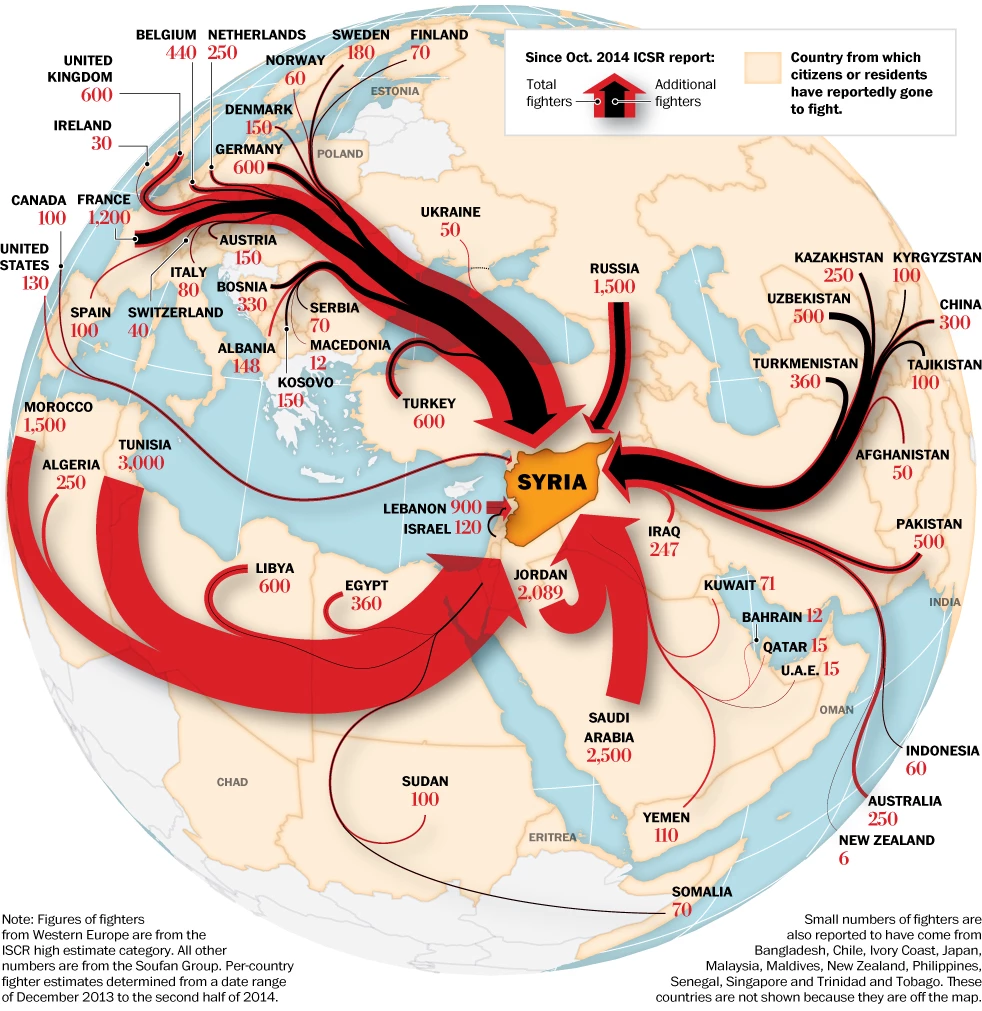 خريطة تبينجنسيات المقاتلين الأجانب في سوريا