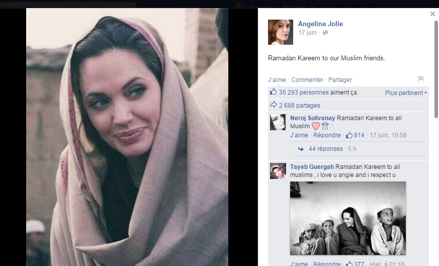 نشرت الممثلة الأمريكية الشهيرية، "أنجلينا جولي" صورة لها على صفحتها في موقع التواضل الاجتماعي وهي ترتدي الحجاب، لتهنئة العالم الإسلامي بقدوم شهر رمضان.