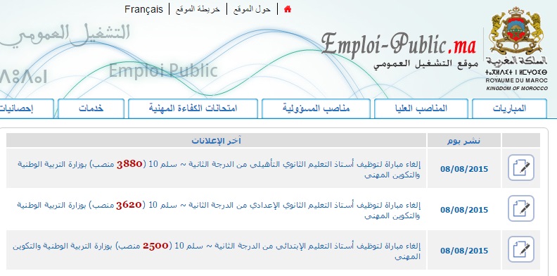 وأعلنت الوزارة عبر موقع التشغيل العمومي الالكتروني إلغاء مباراة لتوظيف أستاذ التعليم الثانوي التأهيلي من الدرجة الثانية سلم 10 (3880 منصب) ، كما تم الإعلان أيضا عن إلغاء مباراة لتوظيف أستاذ التعليم الثانوي الإعدادي من الدرجة الثانية سلم 10 (3620 منصب).