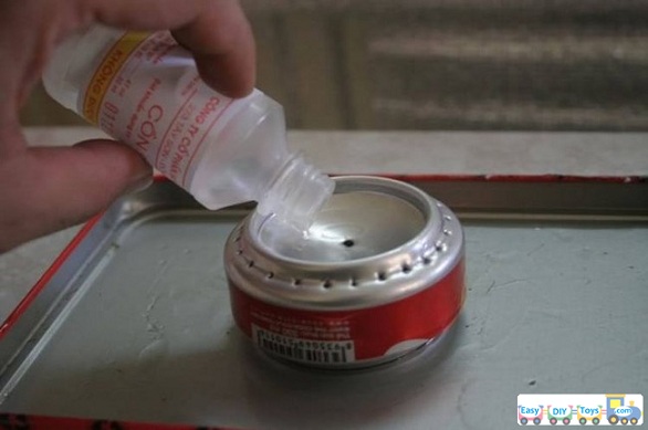 4- يملأ الموقد الصغير بالكحول مع الانتباه إلى عدم سكب أي منها على جوانب، وفي حال حدوث ذلك يجب مسح الكحول المنسكب قبل إشعال الموقد.
